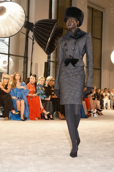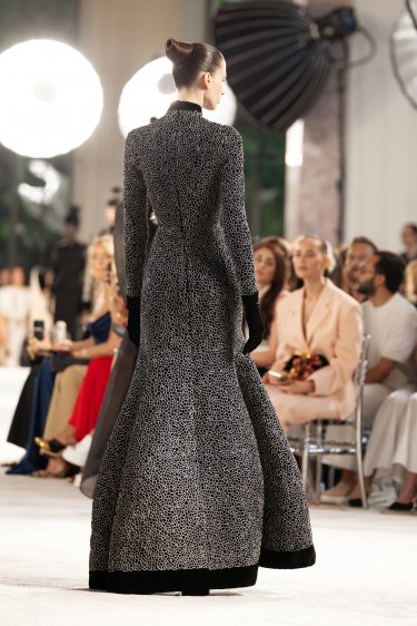 Robe longue ajustée à col montant en velours noir brodé d’un motif animalier créé à partir de fil lamé. Gants en velours noir. Escarpins à talons en satin noir à bride retenue par un bijou en forme de main en métal argenté.