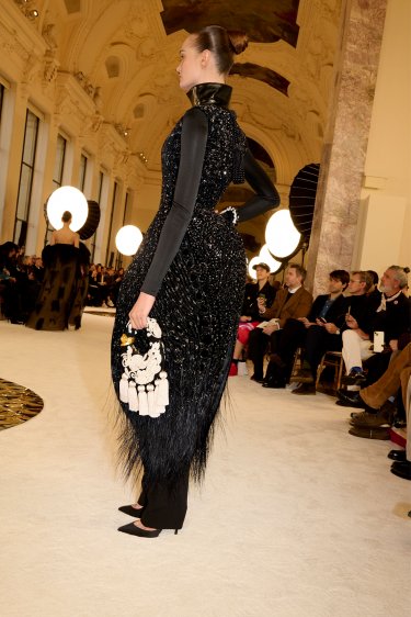 Top à larges épaules en jersey noir. Il est porté sur une jupe en tulle transparent brodée de fleurs et des codes emblématiques de la Maison au point de satin traditionnel et en franges perlées or pâle, ainsi que de bandes de perles or pâle.  Mule à talon brodée de festons et de fleurs avec un décolleté asymétrique et ondulé.  Sac micro Visage en satin brodé d’écailles de poisson peintes et de perles agrémentées de boutons bijoux anatomiques formant un visage en trompe l’œil. Collier ras-du-cou pavé de strass et surmonté de perles.  Boucles d’oreilles rondes en nacre surmontées d’une perle noire et de strass.