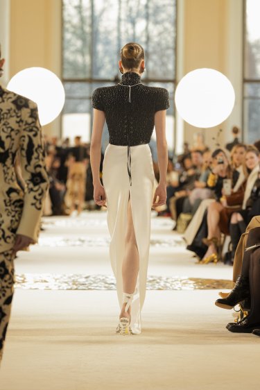 Top à larges épaules en vinyle noir à broderies smockées. Il est porté sur une jupe colonne en double satin couleur sable. Boucles d’oreilles rondes en corian surmontées de perles en nacre. Collier rehaussé d’un pendentif disque en corian surmonté d’une perle en nacre monté sur une chaine de strass. Mule à talon brodée matador rehaussée d’un décolleté asymétrique ondulé.