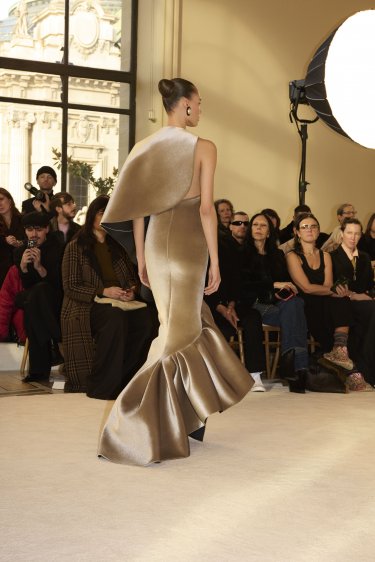 Robe à volants sans couture en néoprène velours couleur vison rehaussée d’une doublure noire contrastée réalisée d’un seul geste. Bottes de cow-boy en cuir noir brillant gaufré effet croco, incrustées d’une oreille moulée recouverte de piercings à strass.