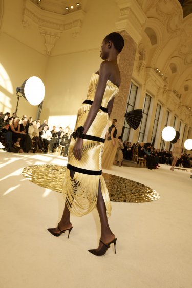 Robe bustier composée de rubans en satin duchesse beurre ouverts rehaussée de bandes de velours noir contrastées. Bracelet fleur en velours noir. Sandale à talon rehaussée d’un décolleté asymétrique et ondulé en toile corset pointillée noire.